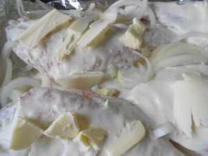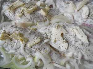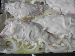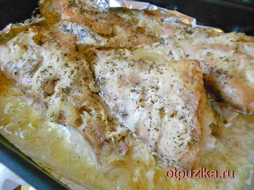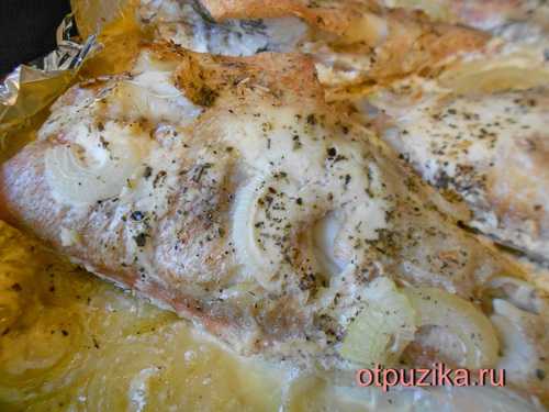 Морской окунь, запечённый с картофелем и луком в сметанном соусе