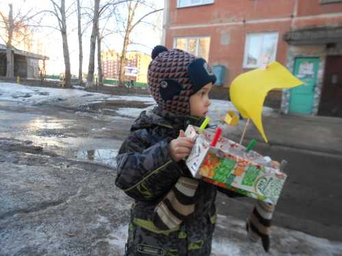 Как здорово сейчас бродить по улицам с сыном, вытаскивать его из луж, садить на качели и самой проваливаться в мокрый снег по уши (а около качелей то ух что творится ;-)). Сделали с ним кораблик и уже запустили.