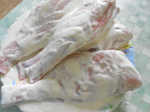 У меня были несколько брюшек морского окуня. Весом около 1200 гр. И поэтому расчет ингредиентов я пишу на это количество рыбы. Кости из рыбы вынимаются достаточно легко, не то что у судака.