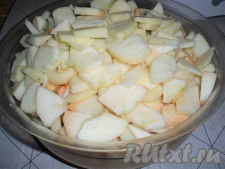 Сушеные яблоки промываем под проточной водой, складываем в глубокую посуду, заливаем водой и оставляем настаиваться на сутки. Свежие яблоки моем, очищаем от кожуры и удаляем сердцевину. Очищенные плоды нарезаем небольшими дольками.