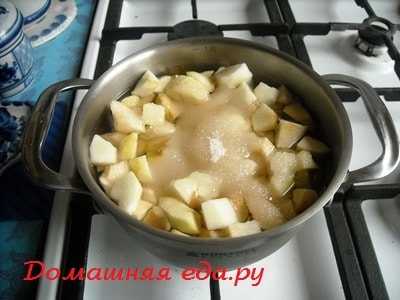 В кастрюлю сложить: 400 гр. очищенных от кожуры и косточек, произвольно нарезанных яблок, 300 гр. сахара. Залить 350 мл. воды, варить 30-40 минут .