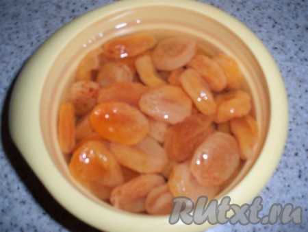 Вымыть курагу, залить кипятком и оставить на 30 минут, чтобы курага разбухла.