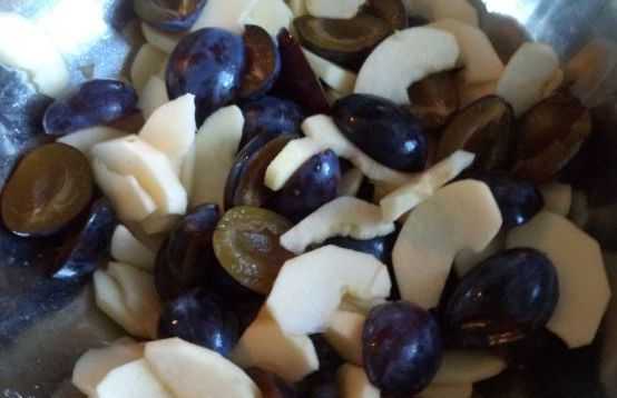 Фрукты моем и просушиваем с помощью бумажного полотенца. Поскольку в данном рецепте используются яблоки в кожуре, то удалять ее не нужно, а вот сердцевину и косточки следует убрать. Сливы разрезаем на половинки и удаляем косточки. Яблоки нарезаем дольками.