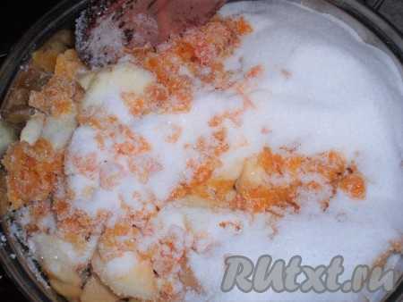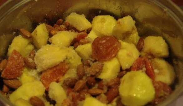 Сложить в сотейник оставшиеся яблоки нарезанные дольками, добавить 300 гр. сахара, промытую курагу, очищенный миндаль, цедру и сок лимона. Перемешать, оставить на 30 минут, чтобы выделился сок.