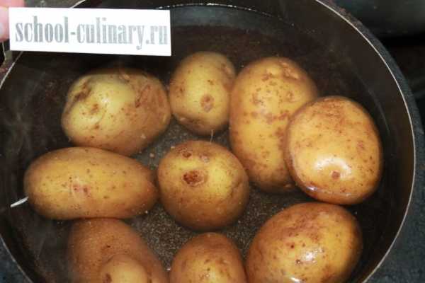 Картофель взять небольшой, не больше куриного яйца, тщательно вымыть и отварить в течение 10 минут.