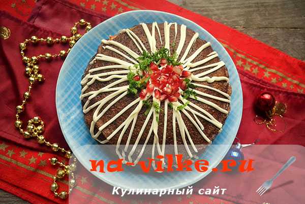 Украсьте печёночный торт по своему вкусу, можно покрыть его сеточкой или полосками майонеза, а в центр насыпать зёрна граната, как на фото.