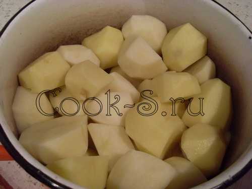 Картофель вымыть, очистить, крупные клубни разрезать на 3-4 части, отварить в подсоленной воде до готовности, примерно 15-20 минут.