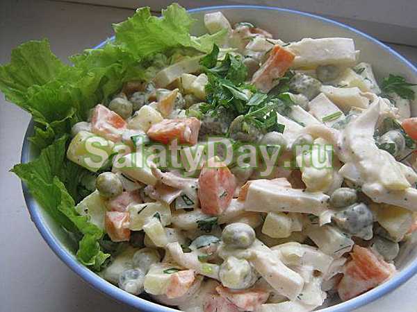 - В вегетарианской версии салата мясо и яйца заменяются консервированной фасолью или зеленым горошком.