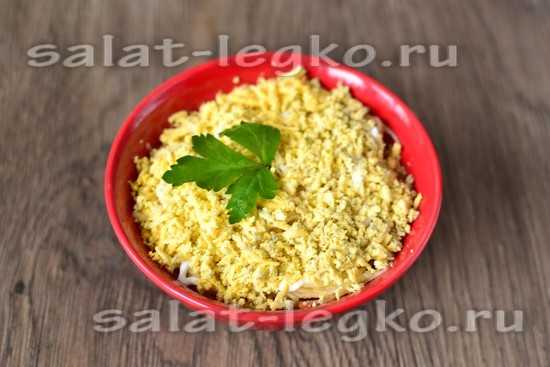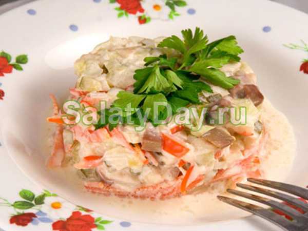 Этот салат тоже заправляется сметаной, но при желании можно использовать и майонез. Блюдо получится более калорийным, но менее вкусным не станет.