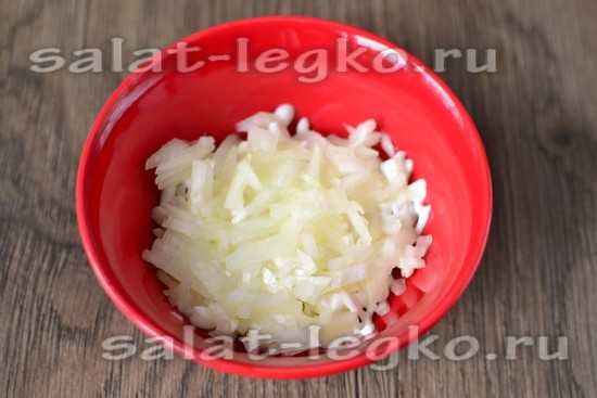 - Тонко нарезать луковицу полукольцами. Лук можно ошпарить для мягкости и удаления возможной горечи.