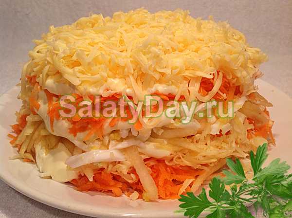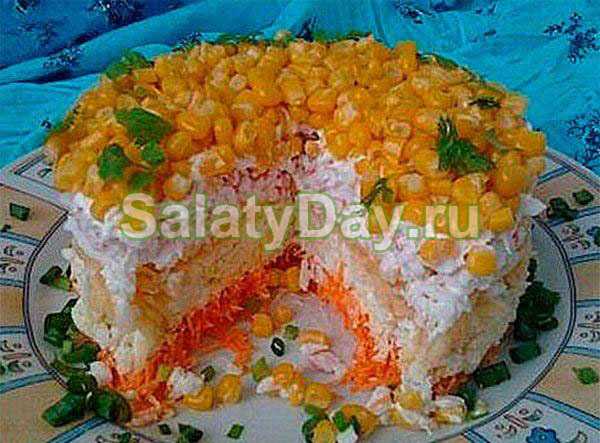 - Далее выкладывать продукты слоями произвольно, чередуя мягкое с хрустящим (например, курица, морковь, яйца, яблоко, ананасы, сыр, кукуруза). Каждый слой смазывать заправкой