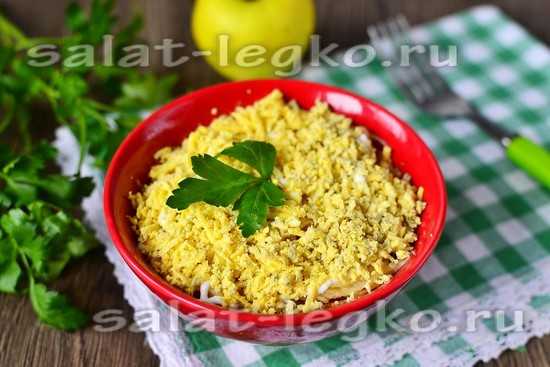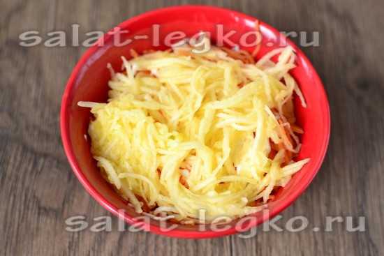 - Приступить к выкладке слоев: морковь, яблоко, яица, крабовые палочки.