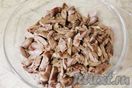 Куриные сердечки отварить и нарезать для салата соломкой.
