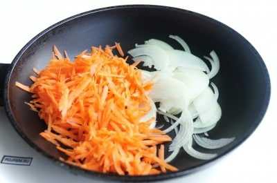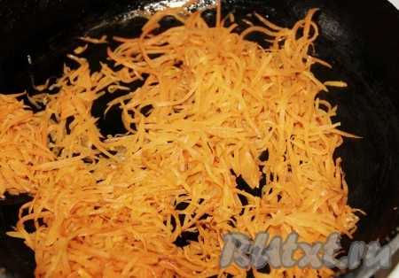Морковь натереть на терке, лук нарезать тонкими полукольцами и пассеровать на сковороде с добавлением растительного масла.