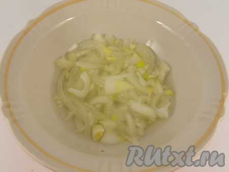 Лук нарезать тонкими кусочками. Уксус развести пополам с водой и залить лук. Оставить на 20-30 минут для маринования.