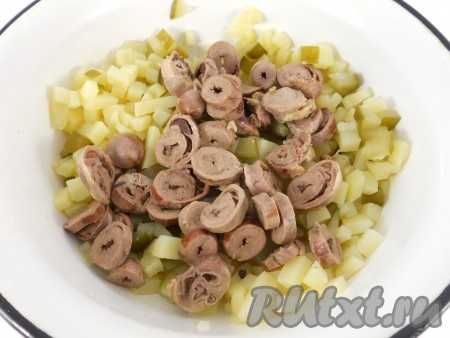 Куриные сердечки остудить и порезать маленькими кружочками, добавить в салат к картофелю и огурцам.