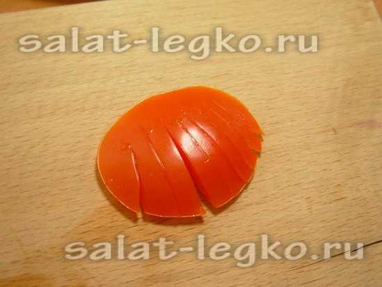 Нарезаем боковушки помидора так, как показано на фотографии – с одной стороны прорезая полностью и не дорезая до другой стороны.