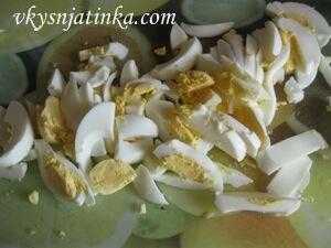 - Очищаем отварные яйца от скорлупы и нарезаем их на тонкие полумесяцы.