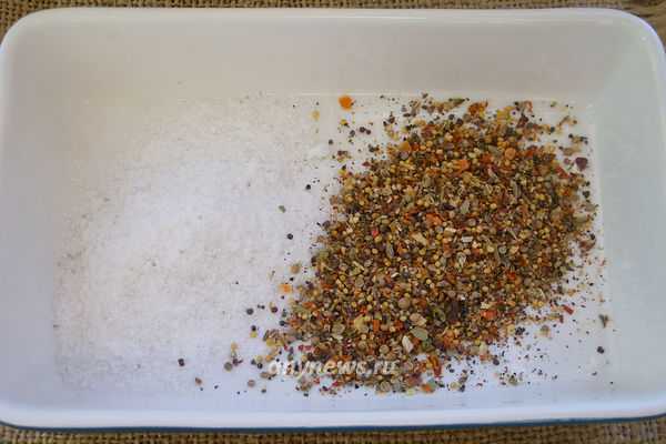 Перемешать. Сало нарезать на кусочки размерами примерно 10х5 см. Если оно толстое, их лучше делать более узкими. Хорошо запанировать каждый кусочек со всех сторон в солевой смеси.