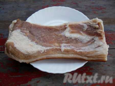Сало старательно вымыть в холодной воде, интенсивно поскоблив при этом его шкурку жесткой щеточкой или просто ножом, оставить до полного высыхания.