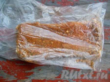 Уложить их в прочный полиэтиленовый пакет. Для верности можно взять сразу два мешка, в процессе просаливания будет выделяться некоторое количество жидкости, и один слой полиэтилена может прорваться и протечь.