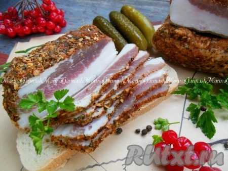 Как только пряное сало остынет, его сразу можно нарезать и есть.