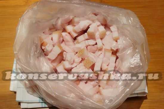 - Свежее сало нарежьте небольшими кусочками, обмойте, хорошо обсушите.