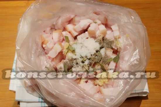 6. На этом этапе пакет следует завязать так, чтобы в нем оставался воздух. После этого энергично встряхнуть. Все ингредиенты внутри полиэтиленового пакета перемешаются. Можно поступить и по-другому. Просто перемешать ингредиенты рукой. После всех этих операций сало в пакете следует убрать в холодильник часов на 5-7.
