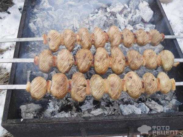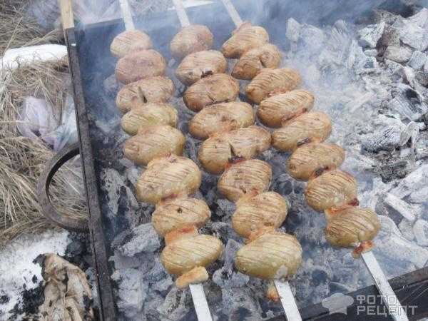 И так картошку на углях жарим минут 40, до готовности. Пожарили сняли с шампуров, блюдо готова к употреблению.