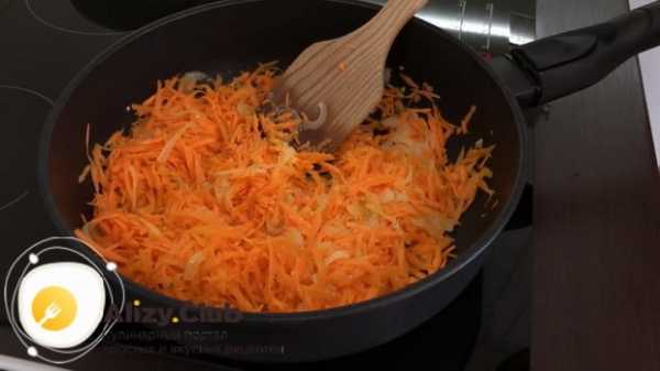 - После того как лук стал мягче отправить к нему морковь, посолить. Жарить лук и морковь до приобретения мягкой консистенции.