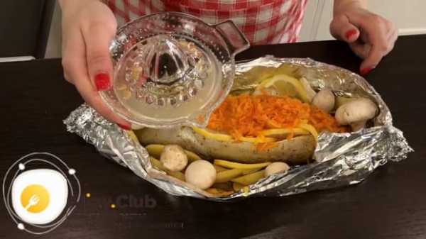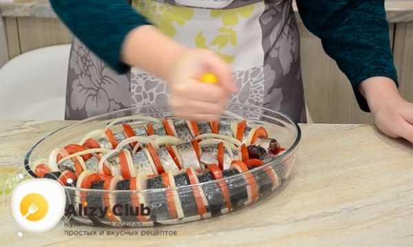 - Сверху на грибы можно выложить оставшиеся дольки лимона. Полить рыбу сверху лимонным соком (оставить 4 ч. л.).
