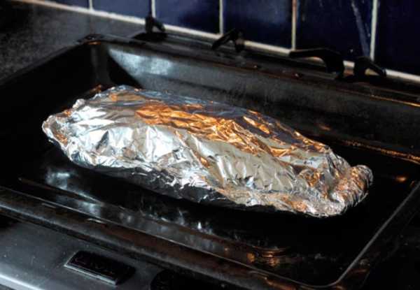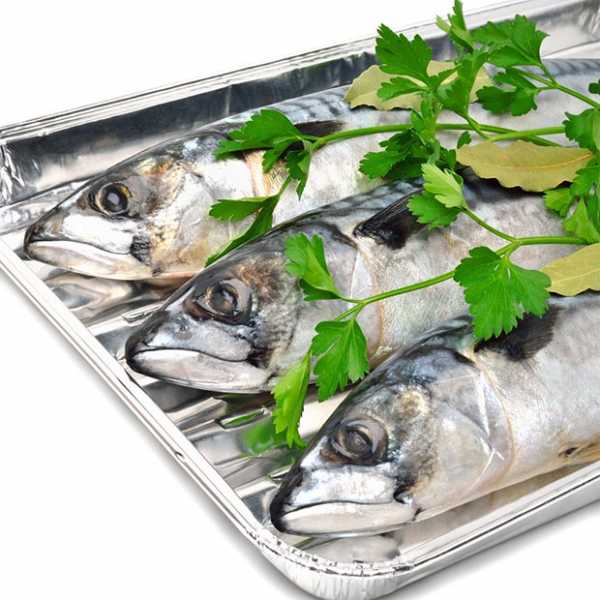 - Фольгу вырезать по размеру рыбы и выложить её в 2 слоя, чтобы она не порвалась. Сделать из фольги карманчик и выложить туда скумбрию спинкой вниз.