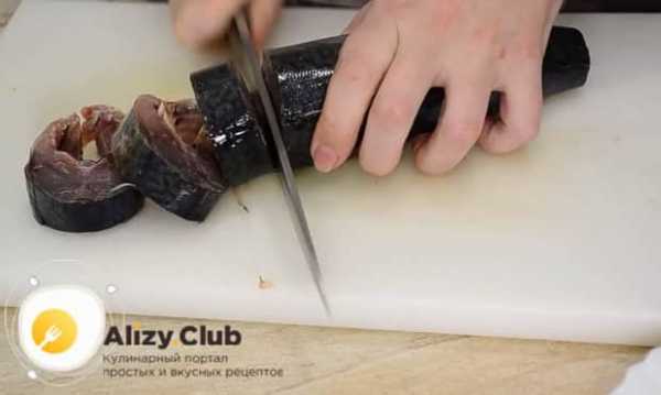 - Удалить внутренности с тушек, промыть, нарезать рыбу на порционные куски.