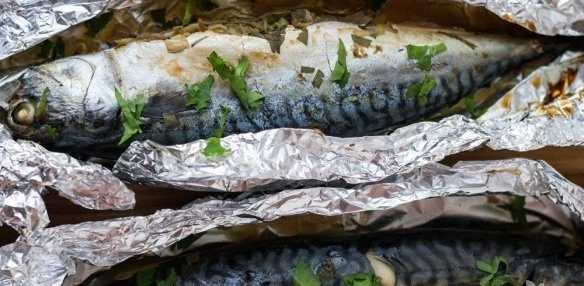 - Сверху на овощи выложить 2 тушки скумбрии.