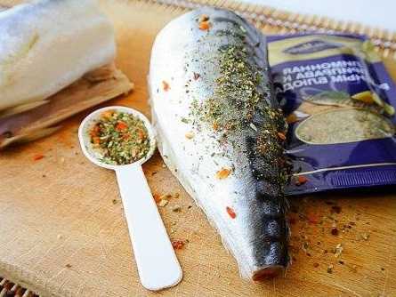 - Посыпать солью, перцем и специями для рыбы по вкусу. Отложить скумбрию в сторону для того, чтобы она промариновалась.