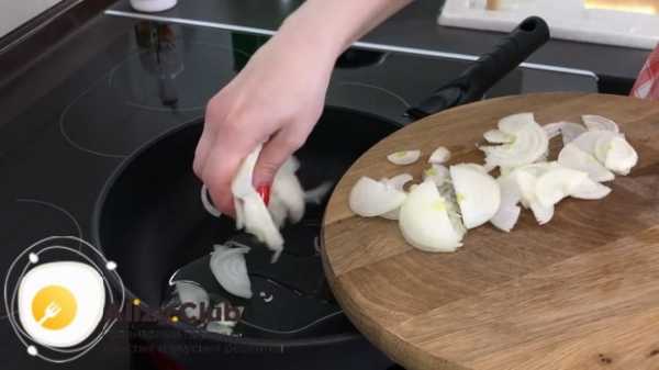 - Раскалить 4 ст. л. растительного масла на сковородке. Пассеровать лук до приобретения им прозрачности (не зажаривать).