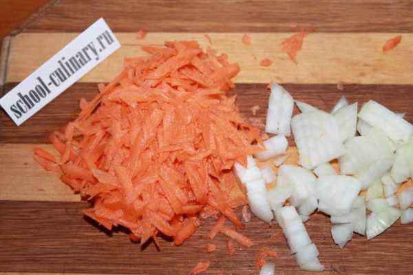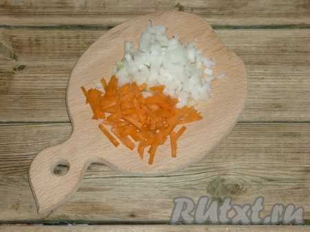 Натираем на крупной терке морковь. Режем помельче репчатый лук.