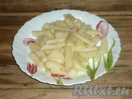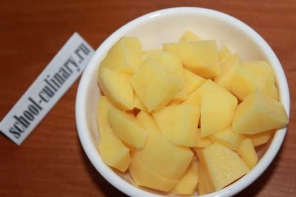 Картофель освободите от кожицы, нарубите кубиком среднего размера. Способ нарезки может быть и другим, например, соломкой.