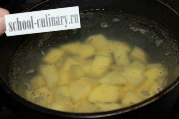 Отправляем картофель в закипевшую воду. После повторного закипания варим картофель на медленном огне 10 минут.