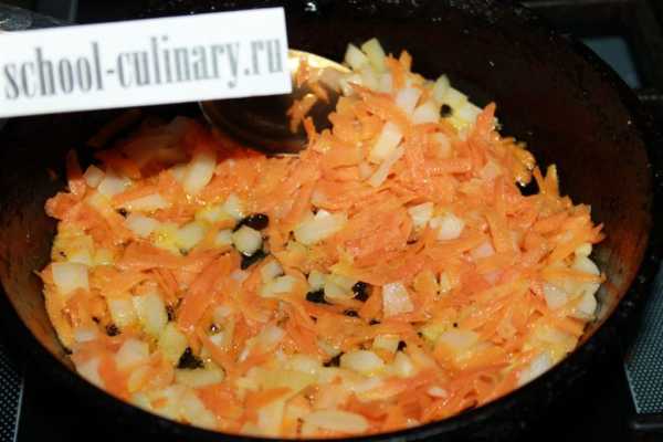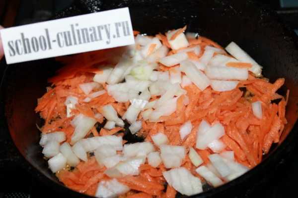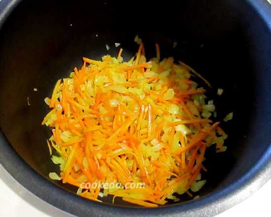В сковороду наливаем растительное масло, хорошо разогреваем его. Выкладываем морковь и лук, жарим 5-7 минут, помешивая.