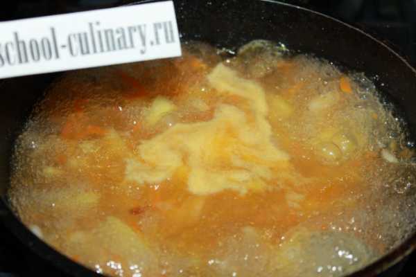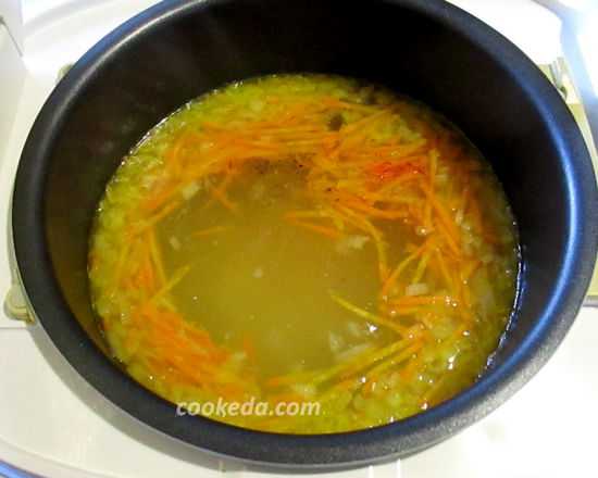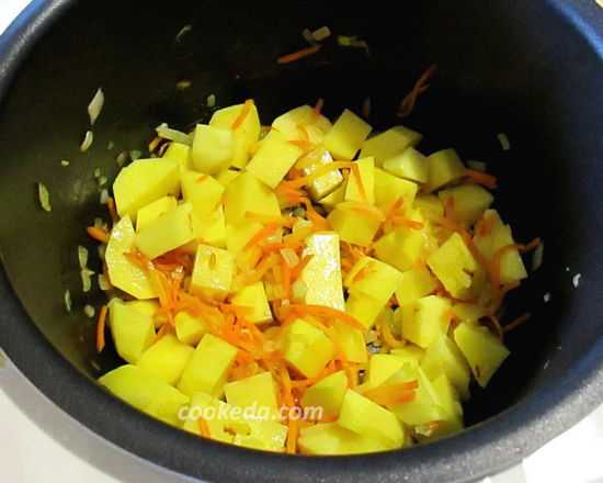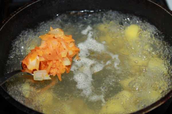 Когда картошка поварится 10 минут, отправляем в бульон зажарку из моркови и лука. Перемешиваем и продолжаем варку.