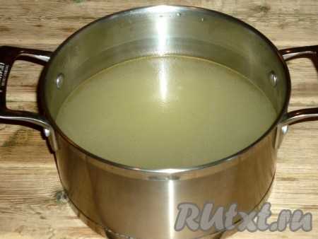 Для приготовления супа лучше использовать любой мясной бульон (с говядины, курицы, индюшки), так он получится более питательным и калорийным. Но блюдо будет ничуть не хуже, если варить его на обычной воде. Налейте жидкость в кастрюлю, переложите в неё нарезанный картофель и отправьте на огонь до закипания.