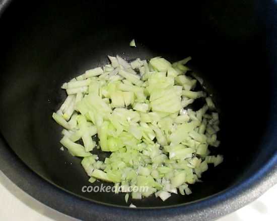 На дисплее мультиварки (у меня Polaris) выберите режим жарки. В чашу налейте масло, разогрейте. Положите лук, нарезанный маленькими кубиками. Пассеруйте его до полупрозрачности, но не поджаривайте. Тогда бульон в супе получится светлым, слегка желтоватым.