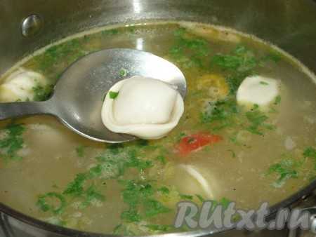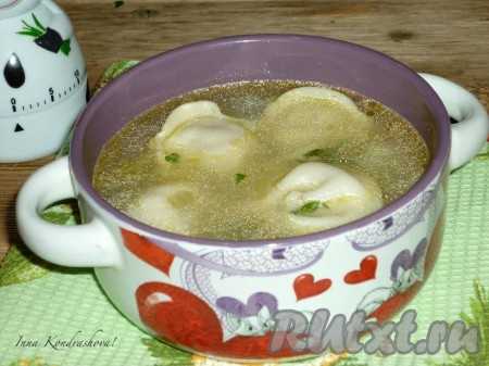 Когда отставите кастрюлю с плиты, дайте блюду настояться 10 минут. Далее разлейте суп с пельменями по глубоким тарелкам.