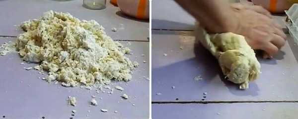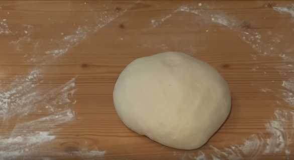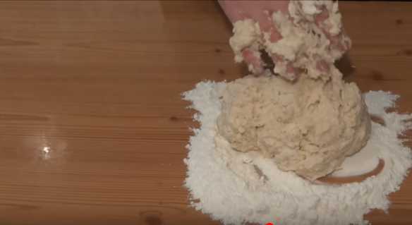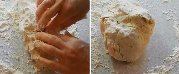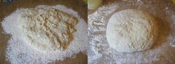 Перекладываем массу на рабочую поверхность и вымешиваем до однородной текстуры, присыпая муку по мере необходимости.