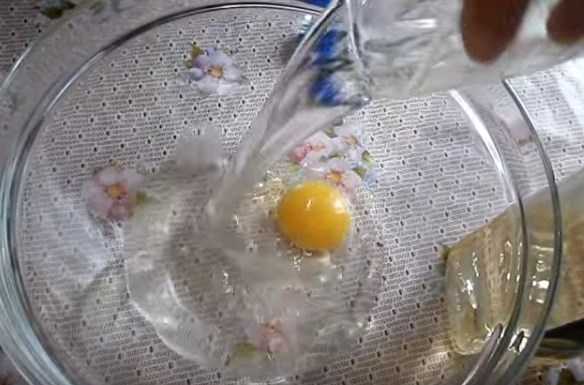Возьмем довольно высокую миску (для удобства) и разобьем в нее пару домашних яиц.