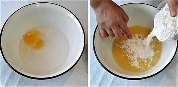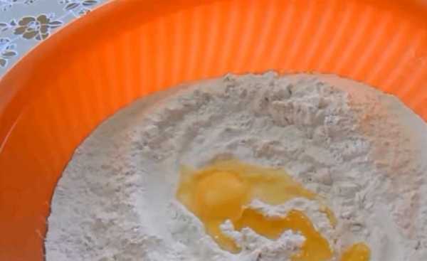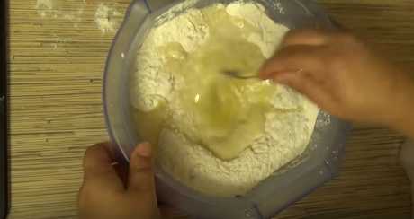 Солим и разбиваем плотную оболочку желтков ручным венчиком, соединяя их с белком в однородную массу. Просеиваем в миску примерно 800 грамм муки, вливаем растительное масло, тепленькую водичку и, перемешивая при помощи обыкновенной вилки все соединяем.