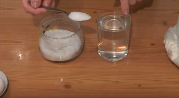 Возьмем 1 стакан воды комнатной температуры, вместимостью 250 миллилитров, добавляем в нее ложку соли с маленькой горкой, размешиваем и даем время для полного растворения соли.