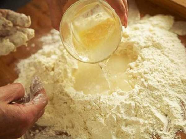 Смешайте воду с 2 яйцами и 2 желтками, добавьте сахар и соль. Просейте муку, насыпьте её горкой, сделайте посередине углубление и влейте в него подготовленную смесь, затем добавьте отдельно взбитые оставшиеся яичные белки. Аккуратно замесите тесто, присыпьте его мукой, накройте полотенцем и оставьте на 15 минут.