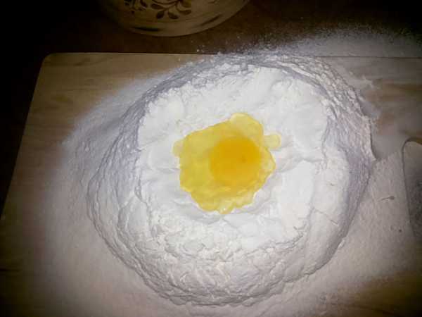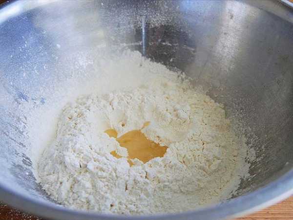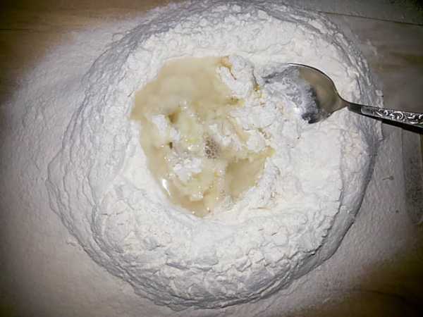 Вилкой перемешиваем и тут же вливаем в углубление в муке. Туда же отправляем 2 яйца и начинаем процесс замешивания той же вилочкой, а затем и рукой, постепенно вмешивая всю муку.
